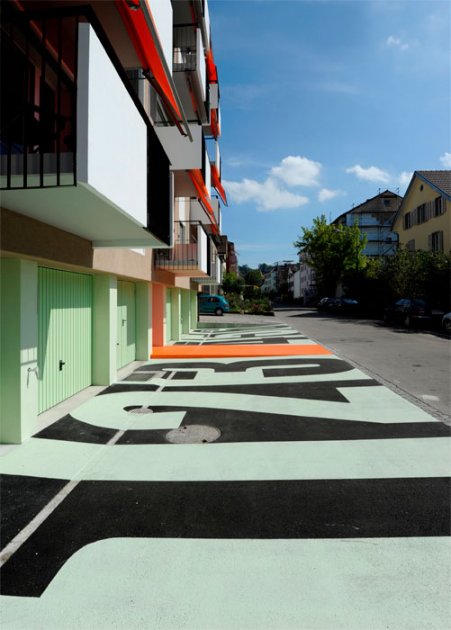 Bei der Ausgestaltung der Fassade, der Farbgebung und der Umgebung haben wir uns zusammen mit Thomas Rutherfoord auf das spezielle Verhältnis von Wohnen und Auto zurückbesonnen. Wir wollten die Eigenarten des Hauses nicht mit Behübschungen und Anstandsgrün übertünchen. Auch im Innern vermitteln geplättelte Bäder, Einbauküchen mit Blechfronten, unifarbene Linolböden und übermalte Rauhfasertapeten das Mietwohnungsgefühl von damals. Die Bewohner lieben das Haus.