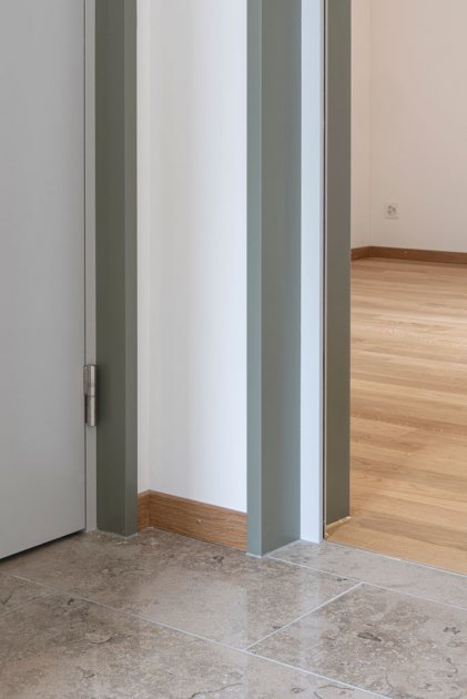 Die rohen Naturmaterialien sind mit feinen Farben kombiniert und werten die natürlichen Farbklänge der Naturmaterialien auf. Aussen sind dies blaugraue Fenster und Wohnungstüren, Innen die graugrünen Abschlussleisten um die Fensterrahmen und Türrahmen.