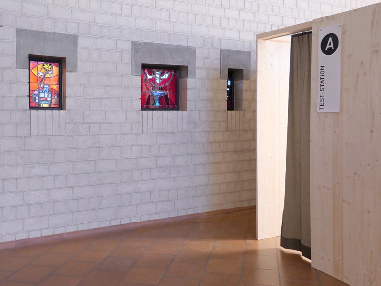 In Absprache mit den Baubehörden und der Denkmalpflege wurden die für den Betrieb notwendigen Einrichtungen mit einfachsten Mitteln eingebaut. Ein Grossteil der Kirchenbänke wurde demontiert und auf der Empore eingelagert. Die möbelartigen Einbauten aus Holz sind nur aufgestellt und können wieder restlos, ohne Schäden am denkmalgeschützten Gebäude verursacht zu haben, entfernt werden. Die Bereiche „Registrierung“, „Test“ und „Labor“ sind funktional auf den Betriebsablauf und den notwendigen Rundlauf der Testpersonen abgestimmt. Bei der Anordnung haben wir aber auch darauf geachtet, dass die architektonische Raumwirkung der Kirche mit den wunderbaren Bilder-Fenstern von Hans Affeltranger erlebbar bleibt und im neuen Kontext gesehen werden kann.