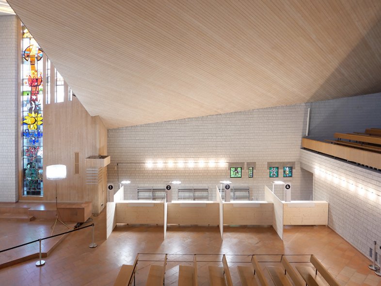 In Absprache mit den Baubehörden und der Denkmalpflege wurden die für den Betrieb notwendigen Einrichtungen mit einfachsten Mitteln eingebaut. Ein Grossteil der Kirchenbänke wurde demontiert und auf der Empore eingelagert. Die möbelartigen Einbauten aus Holz sind nur aufgestellt und können wieder restlos, ohne Schäden am denkmalgeschützten Gebäude verursacht zu haben, entfernt werden. Die Bereiche „Registrierung“, „Test“ und „Labor“ sind funktional auf den Betriebsablauf und den notwendigen Rundlauf der Testpersonen abgestimmt. Bei der Anordnung haben wir aber auch darauf geachtet, dass die architektonische Raumwirkung der Kirche mit den wunderbaren Bilder-Fenstern von Hans Affeltranger erlebbar bleibt und im neuen Kontext gesehen werden kann.