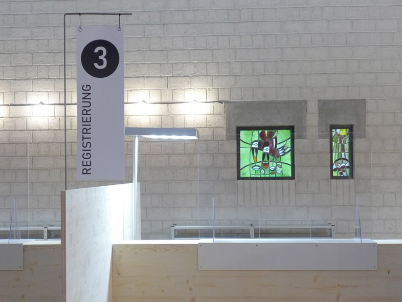 In Absprache mit den Baubehörden und der Denkmalpflege wurden die für den Betrieb notwendigen Einrichtungen mit einfachsten Mitteln eingebaut. Ein Grossteil der Kirchenbänke wurde demontiert und auf der Empore eingelagert. Die möbelartigen Einbauten aus Holz sind nur aufgestellt und können wieder restlos, ohne Schäden am denkmalgeschützten Gebäude verursacht zu haben, entfernt werden. Die Bereiche „Registrierung“, „Test“ und „Labor“ sind funktional auf den Betriebsablauf und den notwendigen Rundlauf der Testpersonen abgestimmt. Bei der Anordnung haben wir aber auch darauf geachtet, dass die architektonische Raumwirkung der Kirche mit den wunderbaren Bilder-Fenstern von Hans Affeltranger erlebbar bleibt und im neuen Kontext gesehen werden kann.