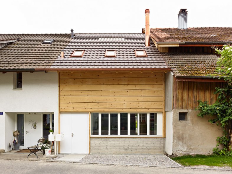 Das neue Wohnhaus mit drei Geschossen ist ein Holzbau mit geringen Raumhöhen und grossen Spannweiten. Es ersetzt den Wohnteil eines alten Bauernhauses.