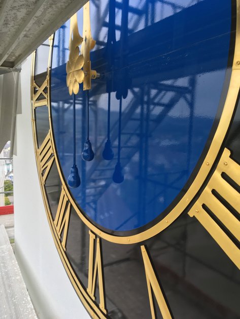 Das Zifferblatt wurde bei dieser Gelegenheit entfernt und ebenfalls restauriert, es erstrahlt wieder im «Zürcher-Blau» zusammen mit den neu vergoldeten Ziffern und Zeigern.