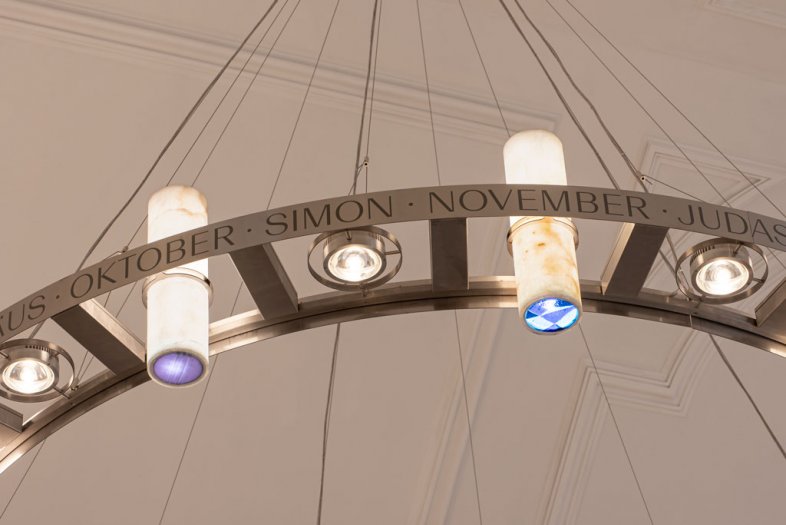 Neu hängt über dem Taufstein ein grosser Radleuchter mit zwei beschrifteten Metallringen und zwölf Alabasterleuchten. Er ist als glänzendes Schmuckstück ausgebildet, markiert das Zentrum der Kirche und bringt den Kirchenraum zum Strahlen. Er bezieht sich auf das himmlische Jerusalem, das in der Bibel in der Johannesoffenbarung beschrieben wird. Einer Beschreibung voller Symbolik, bei der die Zahl Zwölf eine besondere Bedeutung hat: Zwölf Tore, zwölf Edelsteine, zwölf Apostel, zwölf Stammmütter der Stämme aus dem alten Israel – und zwölf Monate im Jahreskreis. Kunstvolle Radleuchter mit der Darstellung von Jerusalem wurden um 1100 in deutschen Kirchen installiert – und nun in einer gestalterischen Neuinterpretation auch in der Schweiz auch in der Kirche Regensdorf.