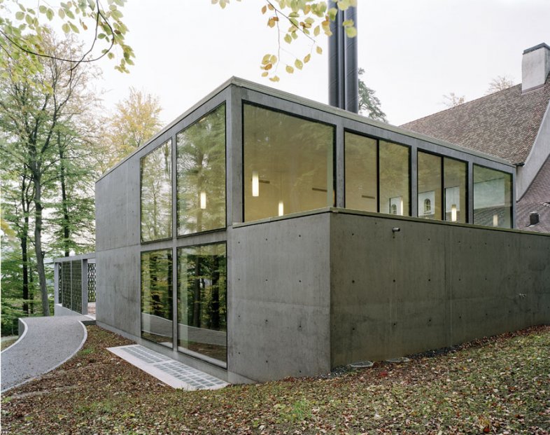 Das neue Krematorium steht als eigenständiger Baukörper neben der bestehenden Abdankungshalle. Das Kremieren mitten im Wald hat in Winterthur eine lange Tradition, die mit der neuen Anlage weitergeführt und neu interpretiert wird. Der Ofenraum ist offen und hell und lässt zum Friedhof und Wald wichtige Ein- und Ausblicke zu.