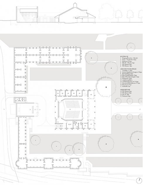 Der offene, einladende Übergangsraum zwischen Vorplatz und introvertiertem Kultraum, können die Besucher wahlweise seitlich oder zentral betreten und wieder verlassen. Das direkte Tageslicht und der Blick in die Umgebung schafft den Filter von Aussen in den inneren Vorbereich. Es ist ein Ort des Zusammentreffens und Ankommens und soll als Foyer und Garderobe genutzt werden können. Die Trennung zwischen diesem Ort und dem Kultraum schafft eine zwei Meter hohe Möbelwand als freistehender Körper im Raum. Auf Seite des Foyers integriert der Möbelkörper eine Garderobe und übernimmt als mögliche Schrankfront Stauraum für mobile Möblierungen. Auf der anderen Seite ist es eine Sitzbank als Rückhalt im Kultraum.