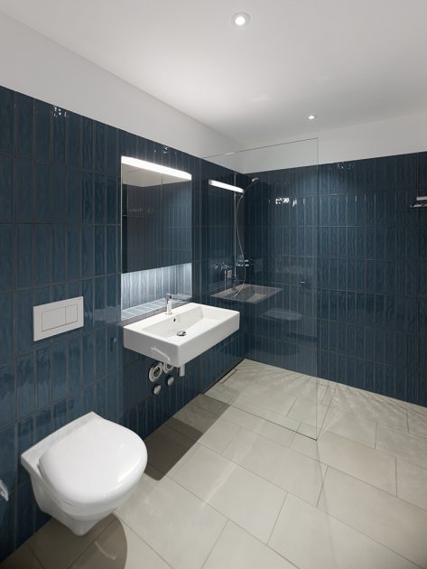 Die Überbauung mit drei kompakten Punktgebäuden als Vierspänner ist in der Höhe gestaffelt und im bestehenden Geländeverlauf gut eingebettet. Die Höhenstaffelung wird bei den Vierspännern durch den halbgeschossigen Höhenversatz innerhalb des Baukörpers mit Split-Level erzeugt. Ein Baukörper ist der niedrigen Kernzone zugewandt und infolgedessen in einen drei- und zweigeschossigen Gebäudeteil gestaffelt.