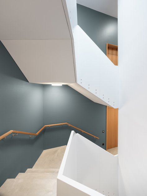 Die Überbauung mit drei kompakten Punktgebäuden als Vierspänner ist in der Höhe gestaffelt und im bestehenden Geländeverlauf gut eingebettet. Die Höhenstaffelung wird bei den Vierspännern durch den halbgeschossigen Höhenversatz innerhalb des Baukörpers mit Split-Level erzeugt. Ein Baukörper ist der niedrigen Kernzone zugewandt und infolgedessen in einen drei- und zweigeschossigen Gebäudeteil gestaffelt.