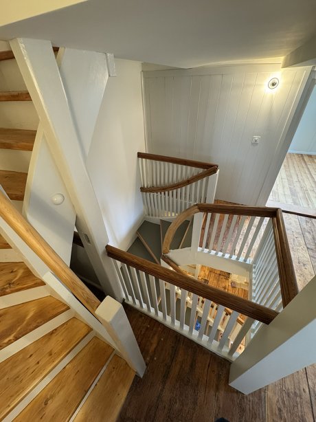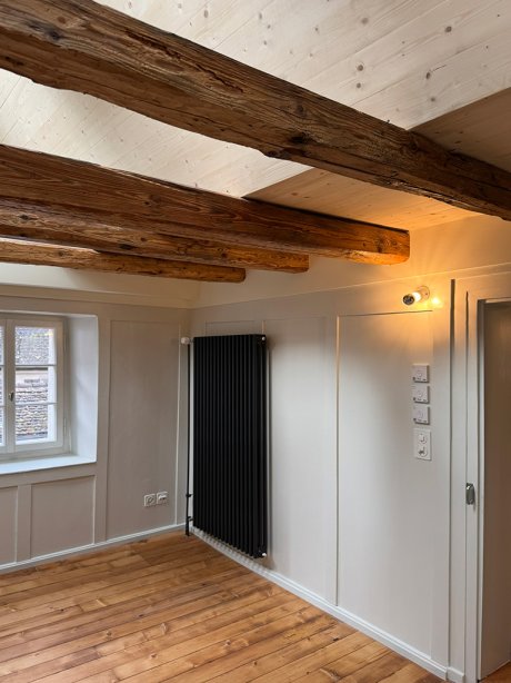 Das vor dem Umbau lediglich mit kleinen Öfen beheizte Gebäude erfuhr eine Totalsanierung. Um die bestehende Gebäudestruktur als Zeitzeuge möglichst belassen zu können, wurde der Wohnteil ab Obergeschoss als eine Wohneinheit konzipiert. Um den Haustechnikaufwand zu minimieren, wurden alle notwendigen Nasszellen (es können bis zu 5 Mietparteien eine Wohngemeinschaft bilden) auf einem Geschoss als «Raumbatterie» zusammengefasst. Dies schonte die bestehende Bausubstanz und die Struktur der mit nur knapp 2.00 Meter Raumhöhe niedrigen Geschosse.