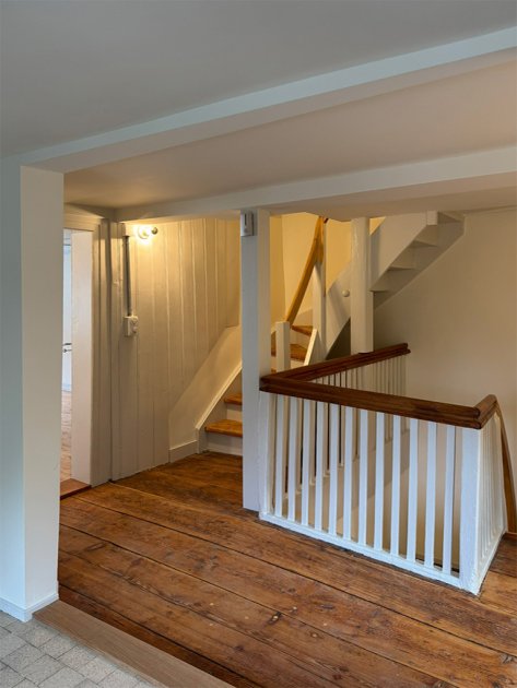 Das vor dem Umbau lediglich mit kleinen Öfen beheizte Gebäude erfuhr eine Totalsanierung. Um die bestehende Gebäudestruktur als Zeitzeuge möglichst belassen zu können, wurde der Wohnteil ab Obergeschoss als eine Wohneinheit konzipiert. Um den Haustechnikaufwand zu minimieren, wurden alle notwendigen Nasszellen (es können bis zu 5 Mietparteien eine Wohngemeinschaft bilden) auf einem Geschoss als «Raumbatterie» zusammengefasst. Dies schonte die bestehende Bausubstanz und die Struktur der mit nur knapp 2.00 Meter Raumhöhe niedrigen Geschosse.