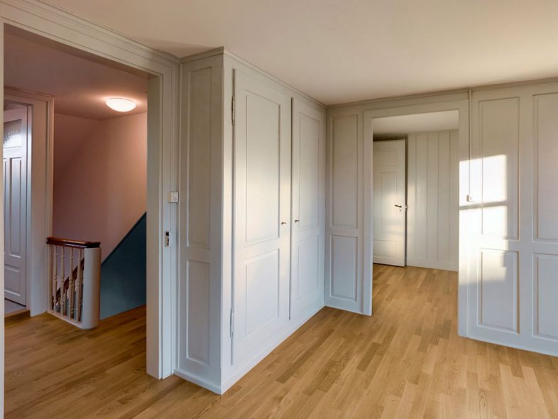 Der blaugraue Farbton, der sich von den Klappläden über die Hauseingangstüre bis ins Treppenhaus zieht, schafft eine Beziehung von Aussen zu Innen. Zusammen mit den zurückhaltenden warmen Grau- und Weisstönen gibt er dem Haus etwas Bürgerliches zurück, das es in den letzten Jahrzehnten verloren hatte.