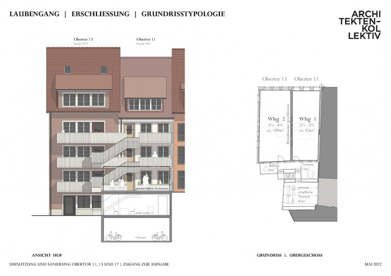 Die beiden Liegenschaften werden in ihre historische Struktur, getrennt durch eine Brandmauer, zurückgeführt. In den Obergeschossen sind je 3 Wohneinheiten, von der Gasse bis zur Hoffassade durchgehend, geplant. Erschlossen werden diese Wohnungen über eine der Hoffassade vorgelagerte Aussentreppe, was im Innern mehr Wohnraum generiert. Auf einen Lift für die Wohngeschosse kann aus unserer Sicht verzichtet werden. Jede Wohnung profitiert von einem Balkon und der gemeinsam nutzbaren Dachterrasse auf dem Hofgebäude, welches neu als Atelier, unabhängig oder mit dem Laden Haus 11 zusammengeschlossen, genutzt werden kann. Die beiden Erdgeschossflächen können zusammenhängend oder voneinander getrennt genutzt werden, beide Treppen und der Lift in die Untergeschosse bleiben bestehen.
