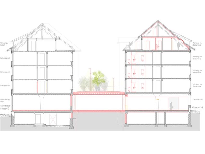 Die Obergeschosse auf Seite Stadthausstrasse baut der Kanton Zürich als Mieter mit einem eigenen Planungsteam um, und richtet in den Räumen eine provisorische Kantonsschule ein. Die Stadt Winterthur erstellt als Vermieterin die behördlichen und gestalterischen Anpassungen der Zugänge sowie eine Velostation im Erdgeschoss. Der Mieterausbau wird vom Kanton mit einem eigenen Planungsteam geplant und realisiert. Die Dachfläche der neuen Hofüberdeckung steht im 1.OG für die Kantonsschule als Pausenhof zur Verfügung.