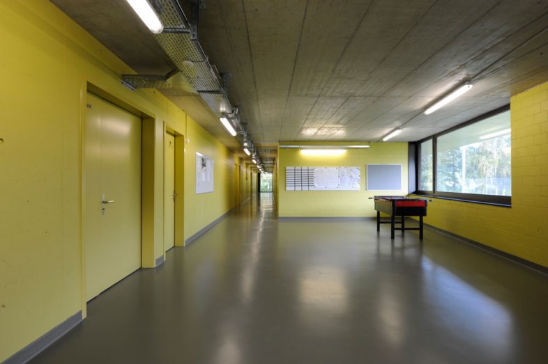 Der schwebende gelbe Baukörper ist in der flachen Landschaft von weither sichtbar. Er markiert das Zentrum der Sport- und Schwimmbadanlage und prägt zugleich den Ortseingang. Alle Sportlerinnen und Sportler sind jetzt unter einem Dach vereint, haben aber je eigene Bereiche zur Verfügung, die den Aussenräumen ihrer jeweiligen Sportart zugewandt sind.