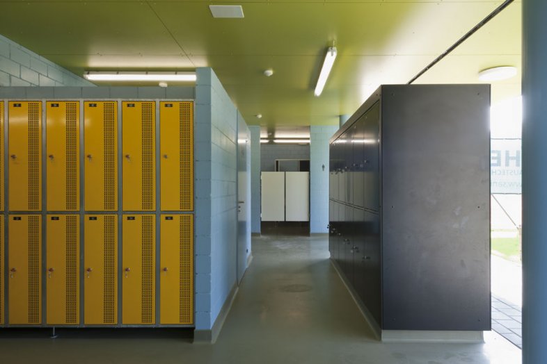 Der schwebende gelbe Baukörper ist in der flachen Landschaft von weither sichtbar. Er markiert das Zentrum der Sport- und Schwimmbadanlage und prägt zugleich den Ortseingang. Alle Sportlerinnen und Sportler sind jetzt unter einem Dach vereint, haben aber je eigene Bereiche zur Verfügung, die den Aussenräumen ihrer jeweiligen Sportart zugewandt sind.