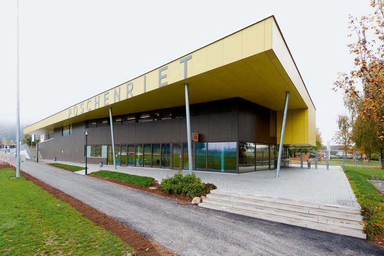 Der schwebende gelbe Baukörper ist in der flachen Landschaft von weither sichtbar. Er markiert das Zentrum der Sport- und Schwimmbadanlage und prägt zugleich den Ortseingang. Alle Sportlerinnen und Sportler sind jetzt unter einem Dach vereint, haben aber je eigene Bereiche zur Verfügung, die den Aussenräumen ihrer jeweiligen Sportart zugewandt sind.
