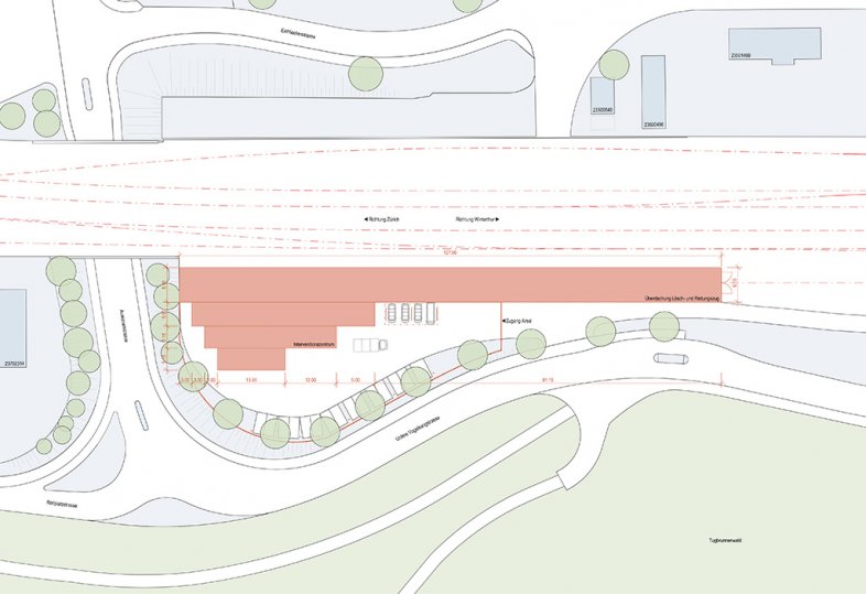 Um im Ereignisfall einen Direktanschluss an den Brüttenertunnel zu gewährleisten, wird ein neues Interventionszentrum Winterthur nördlich des Tunnels im Bereich Försterhaus erstellt. Dieses erinnert an ein Lokdepot. Vier längliche, zweigeschossige Hallen werden aneinandergeschoben und mit einem aufgesetzten Sheddach zusammengebunden. Unter der längsten, komplett offenen Halle befindet sich der Lösch- und Rettungszug, die restlichen drei bilden das eigentlich Interventionszentrum. Konzipiert ist das Interventionszentrum als Holz-Skelettbau. Bloss das Stellwerk im Untergeschoss und ein aussteifender Kern in den Obergeschossen sind in Stahlbeton ausgebildet. Bei der Ausformulierung des Innenraumes hat man sich an den Grundsatz «roh ist fertig» gehalten. Auch im äusseren Erscheinungsbild ist das Material Holz ist sehr prägend. Die grösstenteils geschlossenen Längsfassaden werden mit kleinen Holzschindeln verkleidet. Ein Kontrast dazu bilden die Stirnfassaden. Sie sind als Pfostenriegelsystem geplant und weisen einen grossen Öffnungsanteil vor.