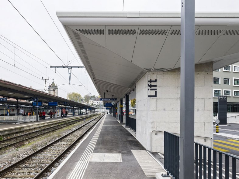 Um das künftige Fahrgastaufkommen zu bewältigen wird der Bahnhof Schaffhausen auf der Nordseite um ein zusätzliches Perron erweitert.  Das neue Perrondach ist expressiv als Flügel ausgestaltet. Es führt die bestehende Struktur des Gleisfeldes und der Perrondachlandschaft weiter und formuliert einen präzisen Übergang zu Stadt. Die elegante Holzkonstruktion wird im Werk vorfabriziert und in Nachteinsätzen auf die Stahlstützen montiert.