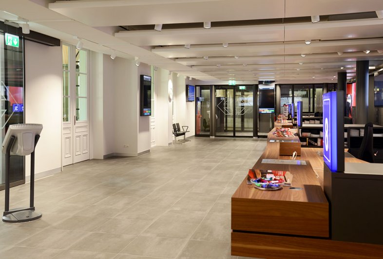 Neben dem neuen Bahnreiszentrum, den Kommerzflächen und dem Bankomatbereich, also jenen Räumen die nun von den Kunden betreten werden, waren flächenmässig ebenso grosse Neben- und Büroräume vom Umbau betroffen. Eine neue Treppe verbindet intern des Erd- und Obergeschoss und schafft für das Personal kurze Wege und effiziente Arbeitsabläufe.
