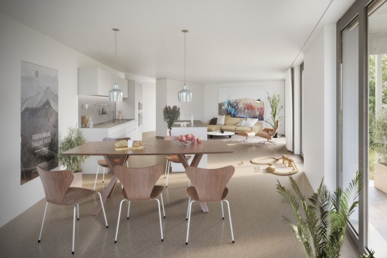 Mit der gewählten städtebaulichen Setzung der drei polygonalen Baukörper wird auf die Umgebung reagiert und einen Übergang zwischen den unterschiedlichen Körnungen geschaffen. Es bleibt dabei die Zugehörigkeit zur Kernzone ablesbar, indem sich die Massstäblichkeit mit den verkürzten Körperlängen an der Kleinstruktur orientiert und die achteckigen Baukörper in ihrer Lage und Ausrichtung bewusst weder einen direkten geometrischen Bezug zu den umliegenden Wohnhäusern noch zur Bollstrasse nehmen. Sie stehen selbstverständlich in der ehemaligen Bauernhofwiese, lassen den Aussenraum um sich herumfliessen und geben unterschiedliche Durchblicke in die Ferne frei. Es entstehen qualitätsvolle Aussenräume sowohl übergeordnet mit den umliegenden Bebauungsstrukturen als auch unmittelbar zwischen den polygonale Baukörpern und den Bestandesbauten auf dem Grundstück selbst.