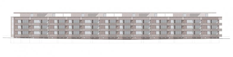 Der lange Nord-Süd ausgestreckte Baukörper mit Ost-West orientierten Wohnungen ist im Gelände verankert und tritt massiv und stark in Erscheinung. Die Klinkerfassade ist Ausdruck von Robustheit und Dauerhaftigkeit und unterstreicht die Bedeutung des Baukörpers, der das Quartier gegen Westen abschliesst und alle Wohnungen auf die einzigartige Allmend ausrichtet. Die sorgfältig ausgearbeitete Tektonik der Fassade mit gestaffelten Rücksprüngen, Eckfensterverglasungen und auskragenden Balkonen, gewährleistet eine Verzahnung mit dem Aussenraum und gliedert die Gebäudelänge.