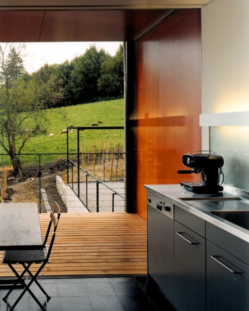 Ist uns Architekten die Aufgabe gestellt ein Gebäude zu entwerfen, wird dessen Beziehung zur Umgebung zu einer gestaltenden Kraft. Diese Grundhaltung prägt auch unser Projekt im Tössertobel. Drei Stützmauern terrassieren das abfallende Gelände und ergeben die Wohnebenen und den Sockelbau für das zweigeschossige Holzhaus. Ein einfacher Kubus umfasst die beiden Hausbereiche mit Transparenz nach innen und aussen. Talseitig säumen umlaufende Balkone den Baukörper. Diese horizontalen Elemente nehmen mit dem Schattenwurf den Fassaden das Frontale und betonen die am Hang geschichtete Gestaltung.