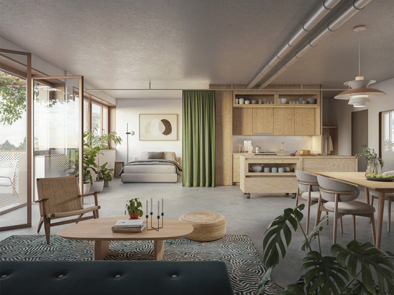 Ein kompakter Einbaukörper aus Seekiefersperrholz mit Nasszelle, Kleiderschrank und Küche bietet den Bewohner die notwendige Grundausstattung. Durch einen Vorhang können Raumteile abgetrennt werden und zwei Rollmöbel dienen wahlweise als Küchenerweiterung oder Sideboard. Dies ermöglicht eine maximale Nutzungsflexibilität. Die an der Fassade angehängten neuen Stahlbalkone passen zur Architektur der damaligen Zeit und machen die Wohnnutzung auch zum Quartier hin sichtbar.