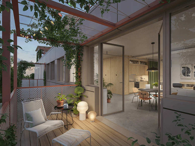 Ein kompakter Einbaukörper aus Seekiefersperrholz mit Nasszelle, Kleiderschrank und Küche bietet den Bewohner die notwendige Grundausstattung. Durch einen Vorhang können Raumteile abgetrennt werden und zwei Rollmöbel dienen wahlweise als Küchenerweiterung oder Sideboard. Dies ermöglicht eine maximale Nutzungsflexibilität. Die an der Fassade angehängten neuen Stahlbalkone passen zur Architektur der damaligen Zeit und machen die Wohnnutzung auch zum Quartier hin sichtbar.