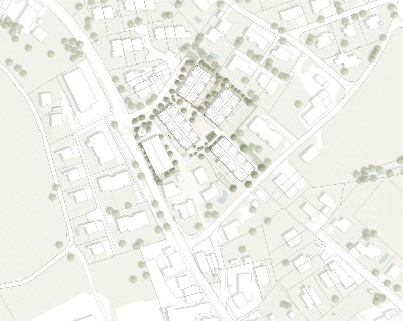 Das Wegsystem und dessen Anknüpfungspunkte sind aus dem Bestand entwickelt. Der bestehende Schulweg ist erhalten, neue Wegachsen sind durch den Iselacher gelegt und verknüpfen den neuen Quartierbaustein mit dem gewachsenen Dorf. Insbesondere der vorgesehene neue Dorfweg verspricht eine Anbindung an die bestehende Dorfstruktur und ermöglicht einen öffentlichen Weg durch die geplante Überbauung, von der Kernzone bis hin zur Bushaltestelle Müselacher.