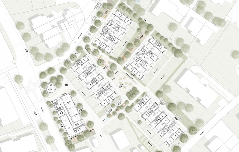 Das Grundstück Iselacher liegt nördlich am Rande des bestehenden Dorfkerns von Bertschikon. Die neue Siedlung orientiert sich an bestehenden Bebauungsstrukturen des Dorfkerns und setzt sich mit den Zeilenbauten von den umliegenden kleinkörnigen und niedrigen Strukturen bewusst ab.